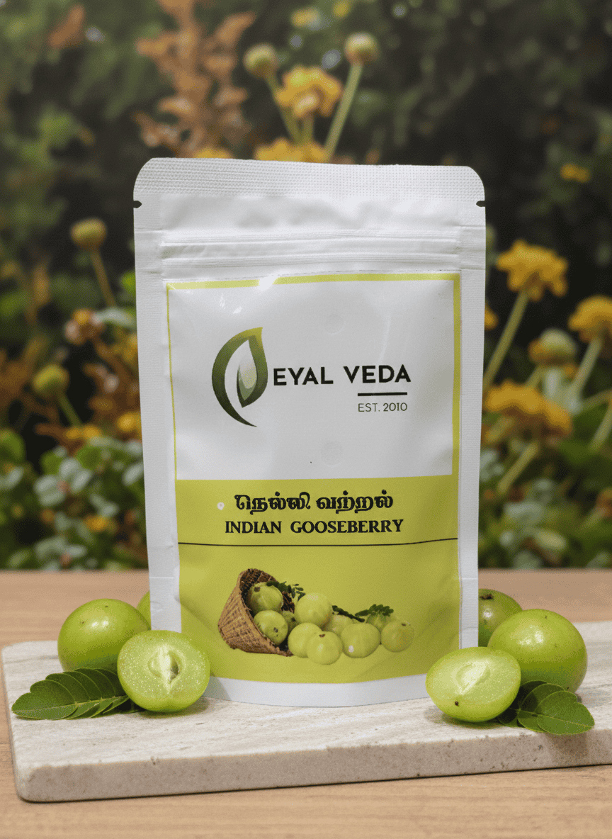 Naturally rich in vitamin C and antioxidants, Nelli Vatral Powder helps strengthen hair roots, improve scalp health, and support digestion and immunity when used as part of a balanced routine.